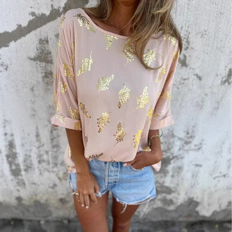 Dam Blus – Relaxed Passform – Båtringning – 3/4 Ärm – Paljetter – Andningsbart Material