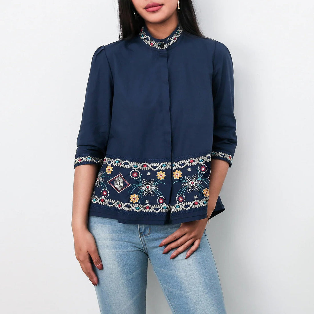 Dam Blus – Relaxad Passform – Broderad – Knäppning – 3/4 Ärm – Naturliga Tyger