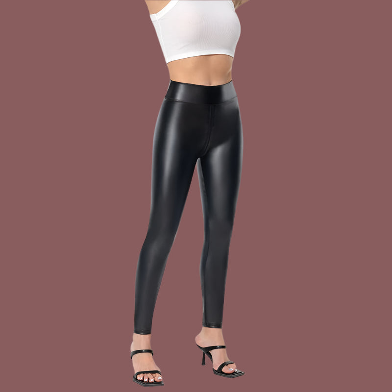 Dam Byxa – Slim Fit – Konstläder – Hög Midja – Glänsande Finish – Dragkedjedetalj