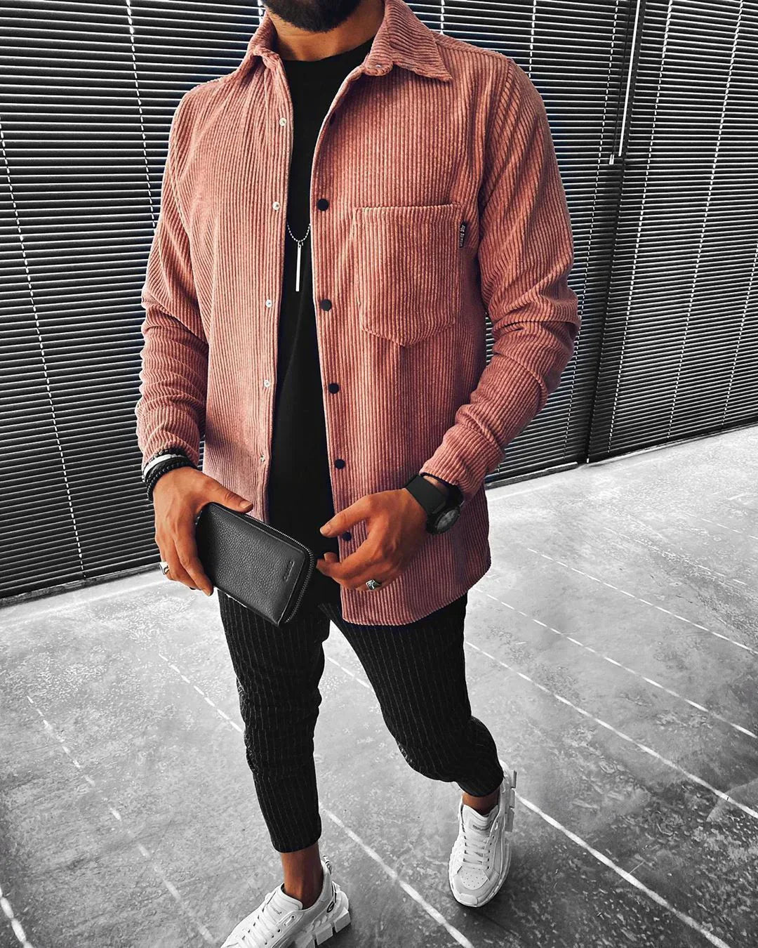 Herrskjorta – Avslappnad Passform – Ribstruktur – Långa Ärmar – Avslappnat Lager