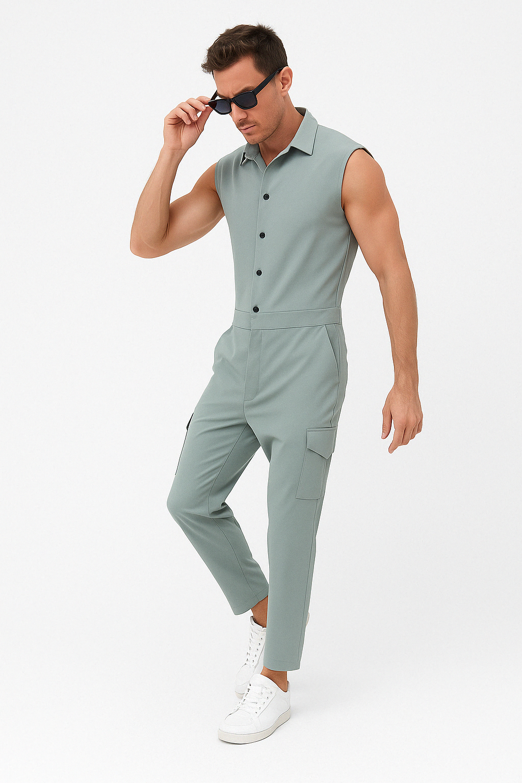 Herr Jumpsuit – Slim Fit – Ärmlös – Knäppning – Skjortkrage – Full Längd
