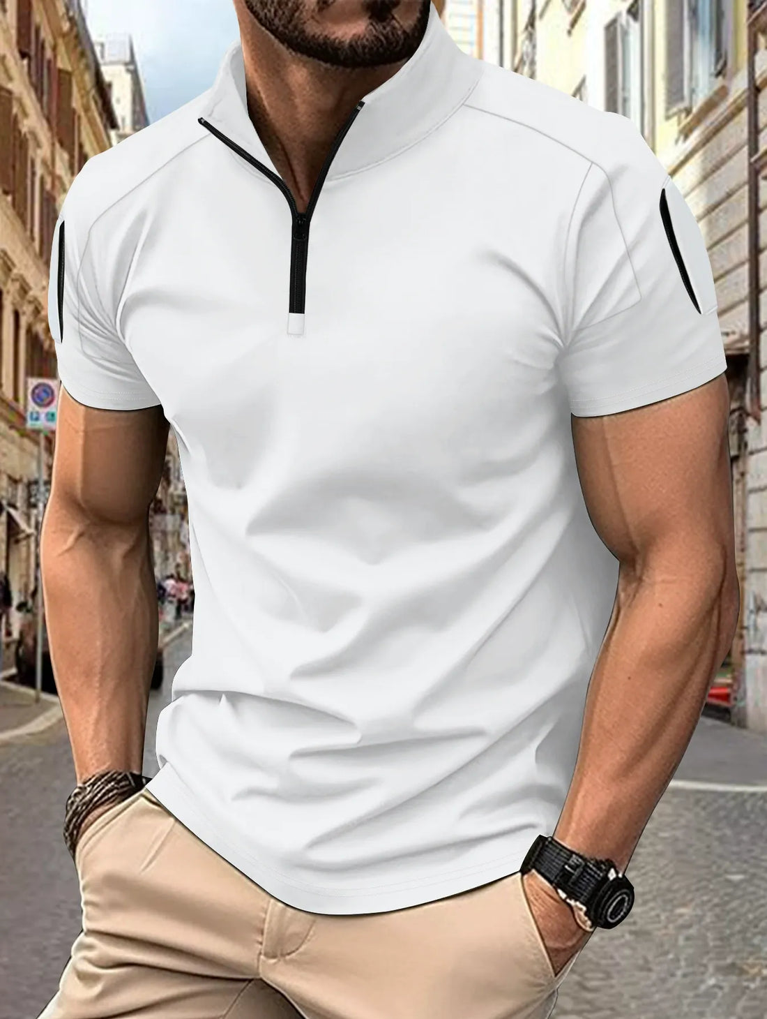 Herr polotröja – Slim passform – Andningsbar bomull – Taktiska ärmfickor – Dragkedjekrage