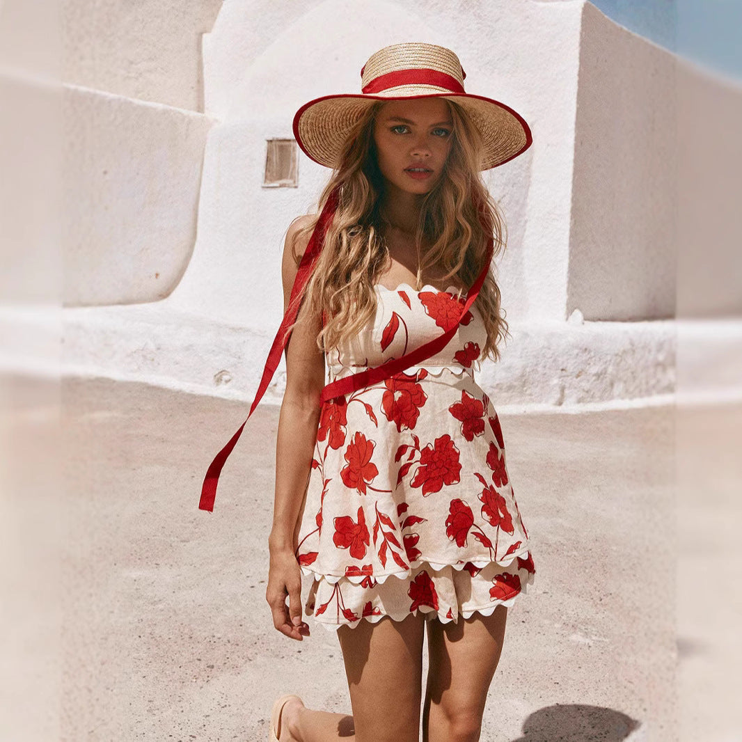 Damer Tvådelat Set – Linne Croppad Topp – Blommönster – Spetsdetalj – Avslappnad Passform