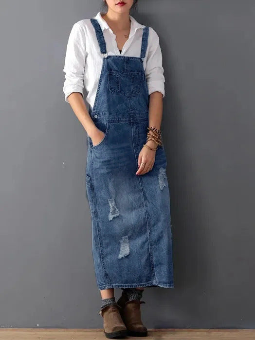 Dam jeansklänning – Avslappnad passform – Midi längd – Justerbara axelband – Vintagestil