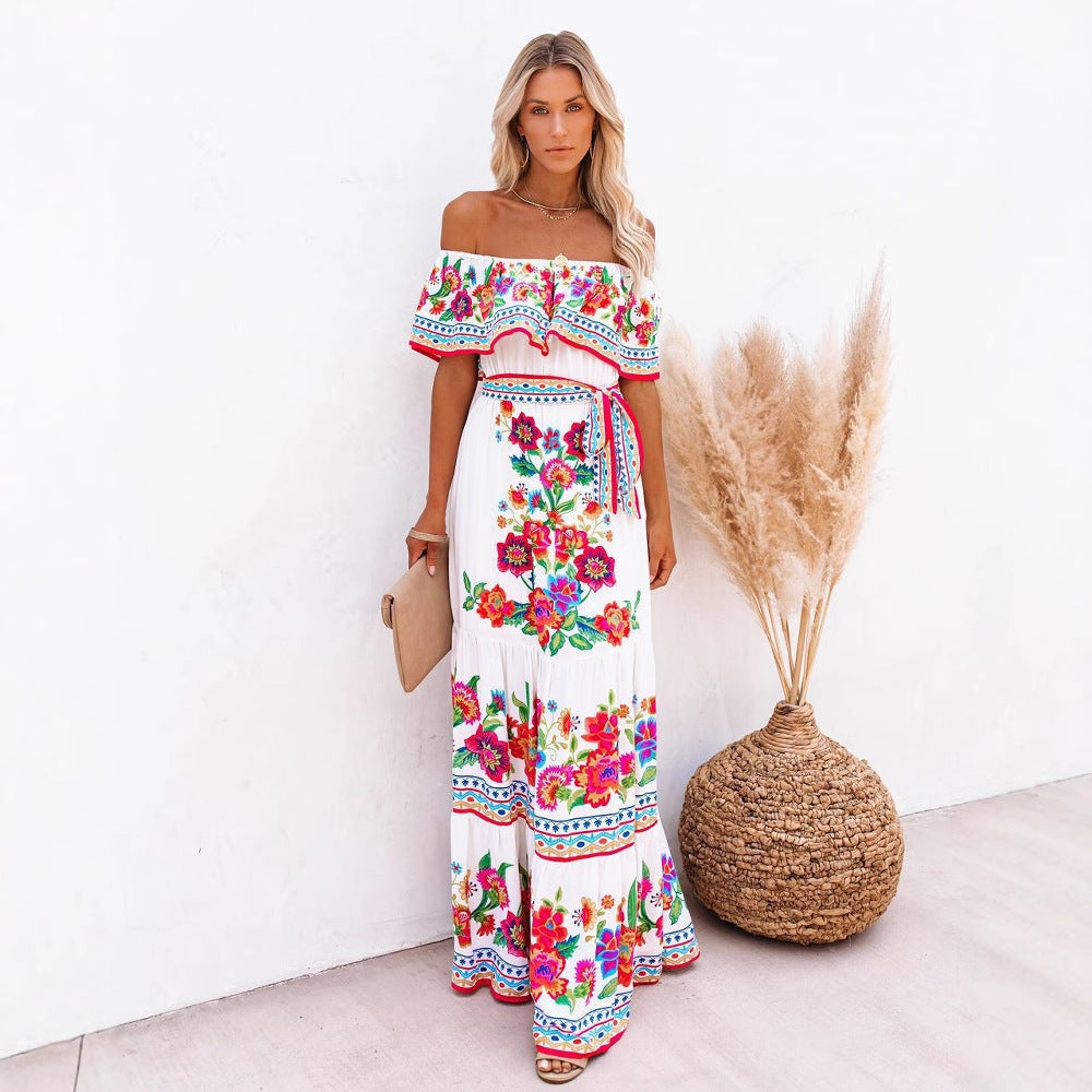 Damer Maxi Klänning – Off-Shoulder – Blommönster – Volanger – Lätt Bomullsblandning