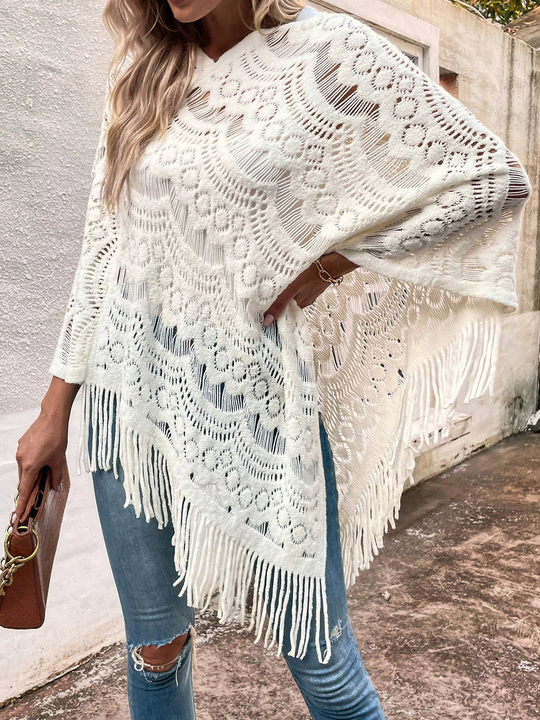 Damer Cape Sjal Kappa – Ullmix – Oversized Passform – V-Hals – Öppen Framsida – Fransar