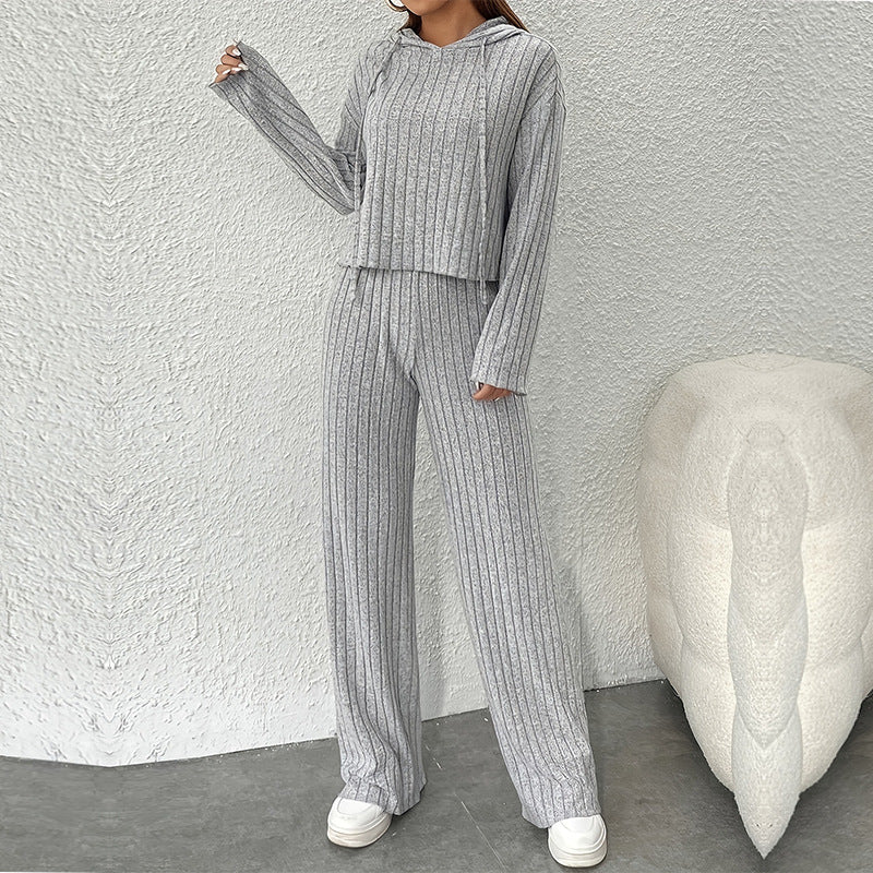 Damer Loungewear Set – Stickat Ribbmönster – Avslappnad Passform – Vida Byxben – Med Huva