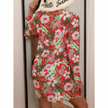 - Design: Korslagd topp med justerbara axelband och high-waist-trosa med livfullt mönster