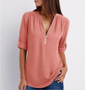 Dames Blouse – Relaxed Fit – Ademend – Halve Rits – 3/4 Mouwen met Oproltabs
