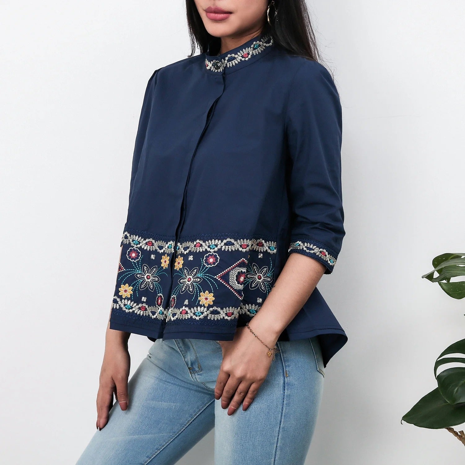 - Design: Avslappnad passform med elegant hög krage och förfinat broderi, dold knäppning