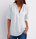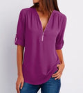 Dam Blus – Ledig Passform – V-Hals med Dragkedja – Upprullade Ärmar – Luftigt Tyg