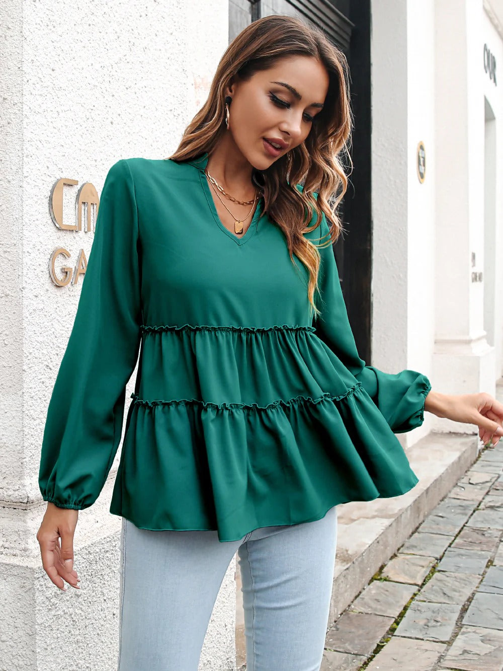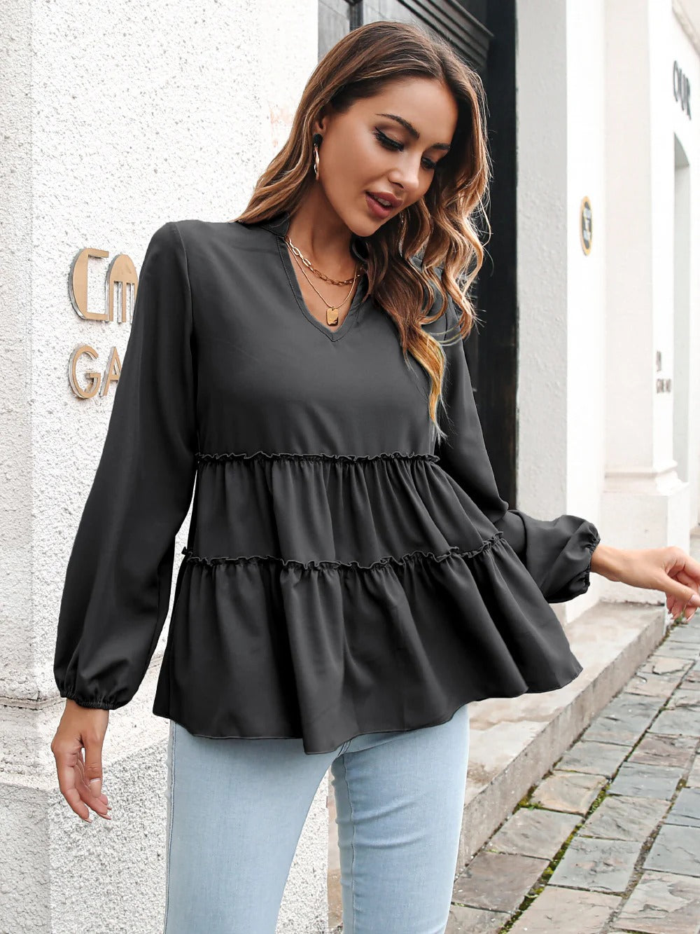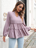 Dam Blus – V-ringning – Löst Sittande Passform – Flerskiktad Design – Långa Ärmar