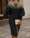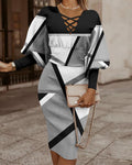 Dam Bodycon Klänning – Figursydd – Rutmönster – V-Ringning Korsdetalj – Långa Ärmar