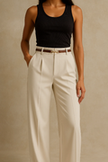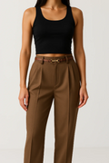 - Ontwerp: Hoge taille, taps toelopend model met enkele plooi; inclusief smalle riem.