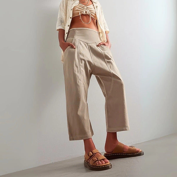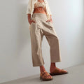 - Ontwerp: Relaxte pasvorm met wijde, cropped pijpen, hoge paper-bag taille en verstelbaar trekkoord.
