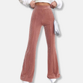 Deze dames broek kenmerkt zich door een hoge taille en een wijde flare, uitgevoerd in een stretchstof met een verticale ribstructuur voor een comfortabele pasvorm.