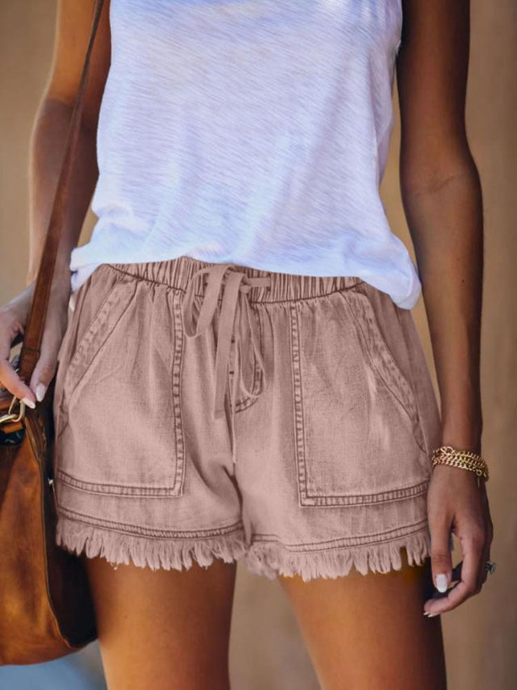 Dam Denim Shorts – Relaxed Passform – Elastisk Midja – Fransad Fåll – Fickor