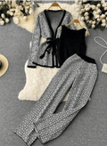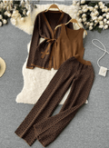 Dit gecoördineerde driedelige damesensemble is vervaardigd uit een fijngebreide stof met een geometrisch patroon en biedt een ontspannen pasvorm voor comfort en stijl.