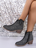 Damer Ankelstövlar – Blockklack – Spetsig Tå – Strass Stenar – Dragkedja