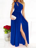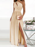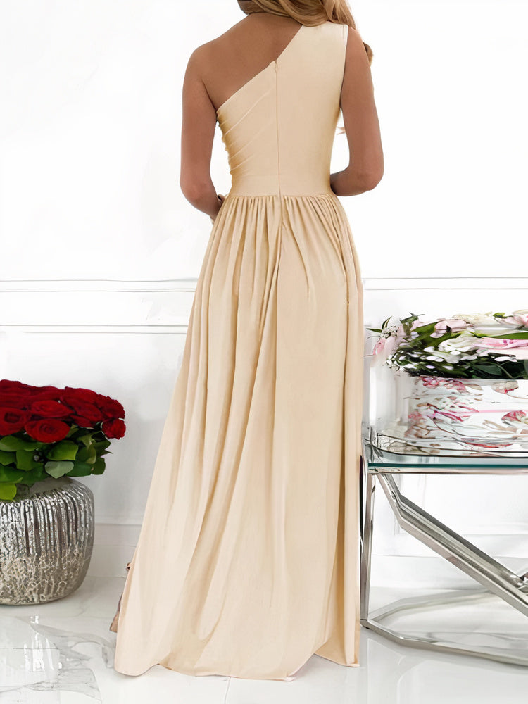 Stralende Dames Galajurk – Chiffon – Asymmetrische Halter – Hoge Split – Plissé Rok – Maxi van Amstel-Mode. Elegante maxi jurk met asymmetrische halslijn, hoge split en plissé rok. Perfect voor speciale gelegenheden!