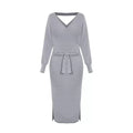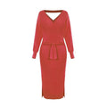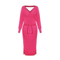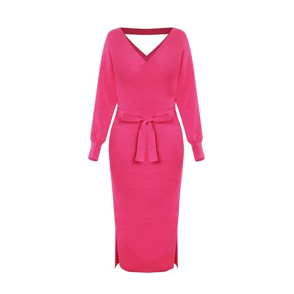 Dam Stickad Klänning – Slim Fit – Midi Längd – V-Ringning – Rosettbälte – Långa Ärmar