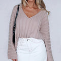 - Ontwerp: Relaxte pasvorm, V-hals, geribde lange mouwen