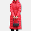 - Design: Vadderad, knälång med rymlig huva, funktionella fickor och tryckknappslutning