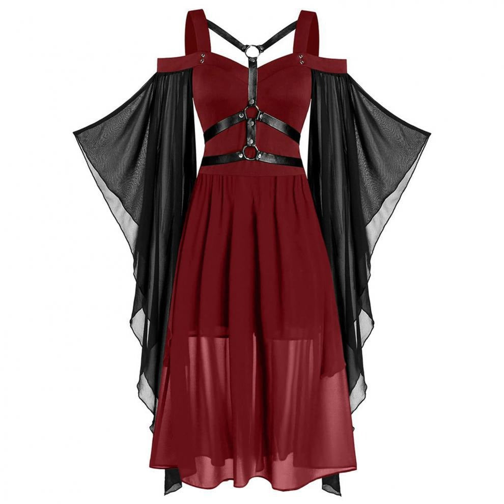 Dam Gothisk Midi Klänning – Fit och Flare – Trumpetärmar – Sele – Asymmetrisk Fåll