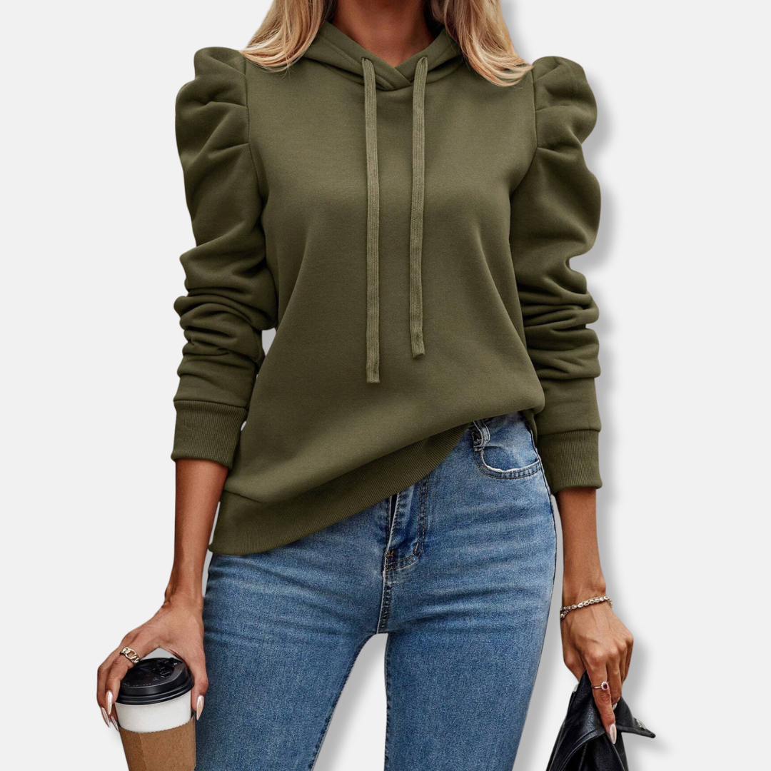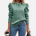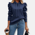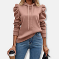 Deze dames hoodie is vervaardigd uit een zachte, glad gebreide stof en kenmerkt zich door pofmouwen en geribde boorden. De capuchon is voorzien van een verstelbaar trekkoord.