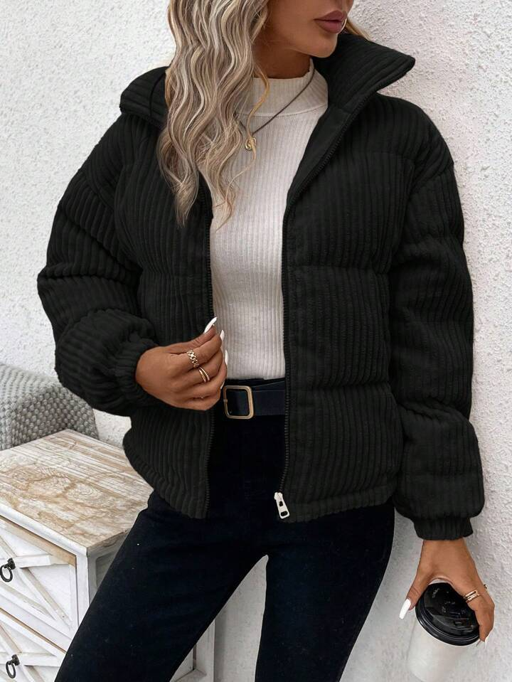 Upptäck den oumbärliga vadderade corduroyjackan med hög krage från Amstel-Mode. Denna damjacka kombinerar komfort med stil tack vare det varma vadderade corduroytyget, den praktiska dragkedjan och den höga kragen. Idealisk för avslappnade dagar, erbjuder den en avslappnad passform och är perfekt för ansträngningslös chic.