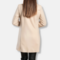 Deze halflange dames jas is vervaardigd uit een gladde geweven stof en heeft een getailleerde pasvorm met brede revers.
