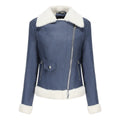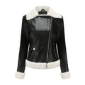 Dames jas van imitatieleer met een gestructureerde pasvorm, heuplengte en asymmetrische ritssluiting, afgewerkt met imitatiebont accenten.