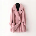 Deze midlange damesjas is vervaardigd uit echt schapenvacht en heeft een oversized pasvorm. Het ontwerp is dubbelgeknoopt met een brede reverskraag.