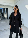 - Design: H-linje passform, dubbelknäppt med kavajkrage och fickor med klaffar