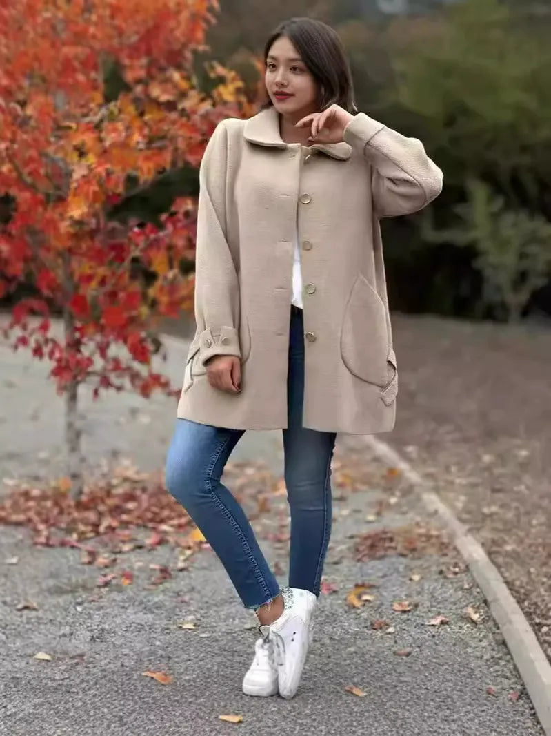 Damkappa – Ull – Relaxed Passform – Mellan-Längd – Knäppning – Påsydda Fickor