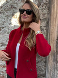 Deze dames jas, vervaardigd uit een getextureerde wolmix, kenmerkt zich door een boxy pasvorm en een opstaande kraag. De jas valt tot op de heup.