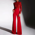 Höj din modekänsla till en högre nivå med denna jumpsuit med långa ärmar och bälte, en elegant utsvängd byxa och en delikat spetsöverdel. Perfekt för att göra ett statement vid alla evenemang, kombinerar denna outfit tidlös elegans med en samtida stil. Med den iögonfallande designen och den perfekta passformen utstrålar du självförtroende och klass.