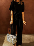 - Design: Avslappnad passform, vida ben, dragsko i midjan, korta ärmar, rund hals