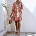 - Design: Luftig passform, V-ringning, 3/4 volangärmar, blommönster, veckad midja