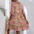 Damklänning – Flödande Passform – V-Ringning – 3/4 Volangärmar – Blommönster – Bomull