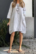 Damklänning – Linne Bomull – A-linje Passform – 3/4 Ärm – Knälängd – Fickor