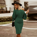 Damklänning off-shoulder – mjuk stickad – midi längd – voluminösa ärmar