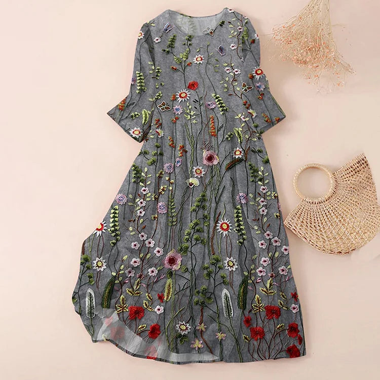 Damklänning – Avslappnad Passform – Knälängd – Andningsbart Material – Broderad Vintage Design