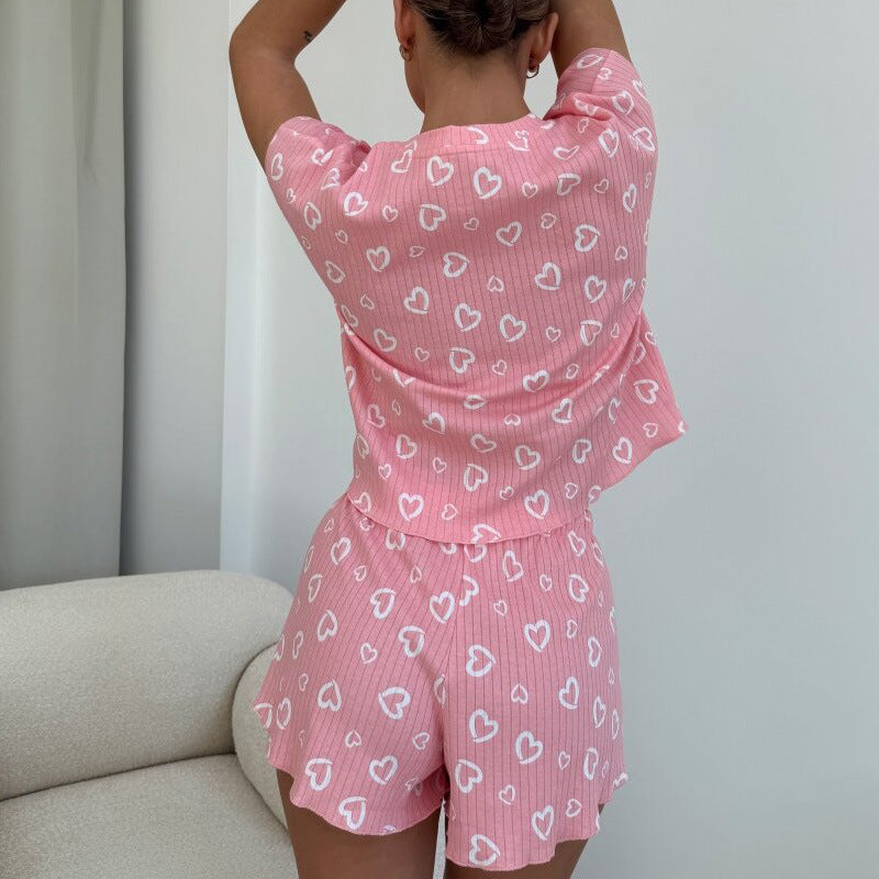 Damer Lounge Set – Bomullsblandning – Hjärtmönster – Ledig Passform – Rund Hals – Kort Ärm