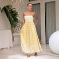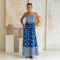 Dames Maxi Jurk – A-lijn Pasvorm – Katoen – Spaghettibandjes – Gestreept met Stippen – Met Zakken. Deze luchtige katoenen maxi jurk van Amstel-Mode combineert comfort met stijl. De A-lijn pasvorm, spaghettibandjes en speelse streep-met-stippen print maken het de perfecte zomerjurk, terwijl de handige zakken een praktische touch toevoegen.