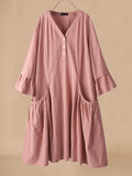 Damer Midi Klänning – Bomull Linne Mix – V-Ringning – Utsvängda Ärmar – Avslappnad Passform – Fickor