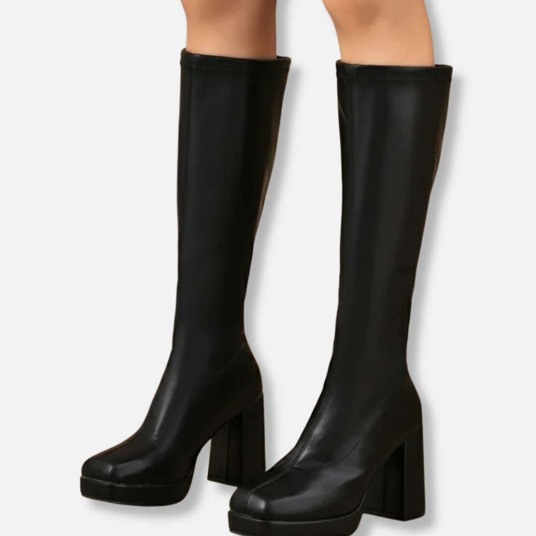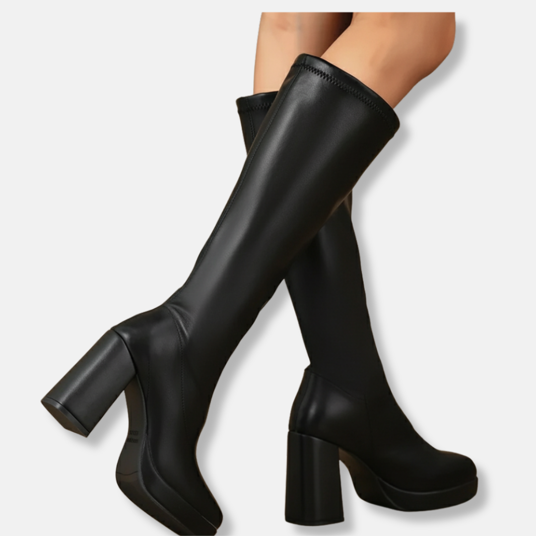 - Design: Overknee med chunky klack, platåsula och rund tå
