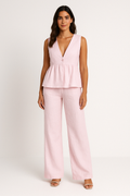- Design: Modern, tvådelad byxkostym med peplumdetalj på västen.