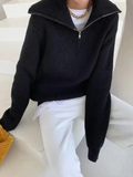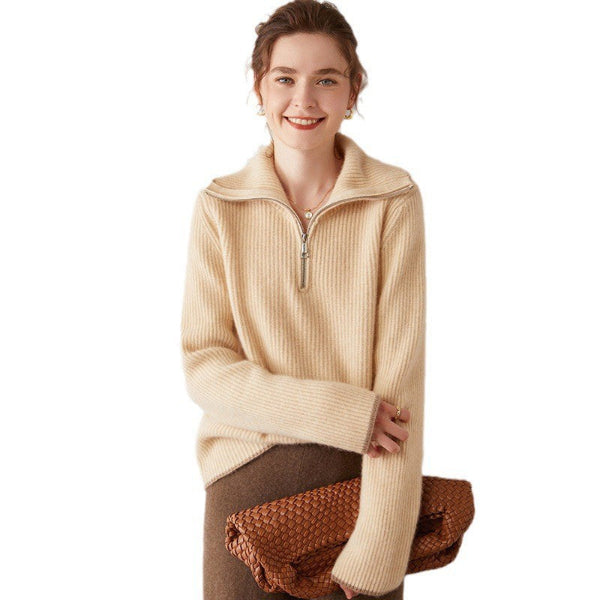 Dam Pullover Tröja – Ull – Avslappnad Passform – Hög Dragkedjekrage – Ribbade Kanter