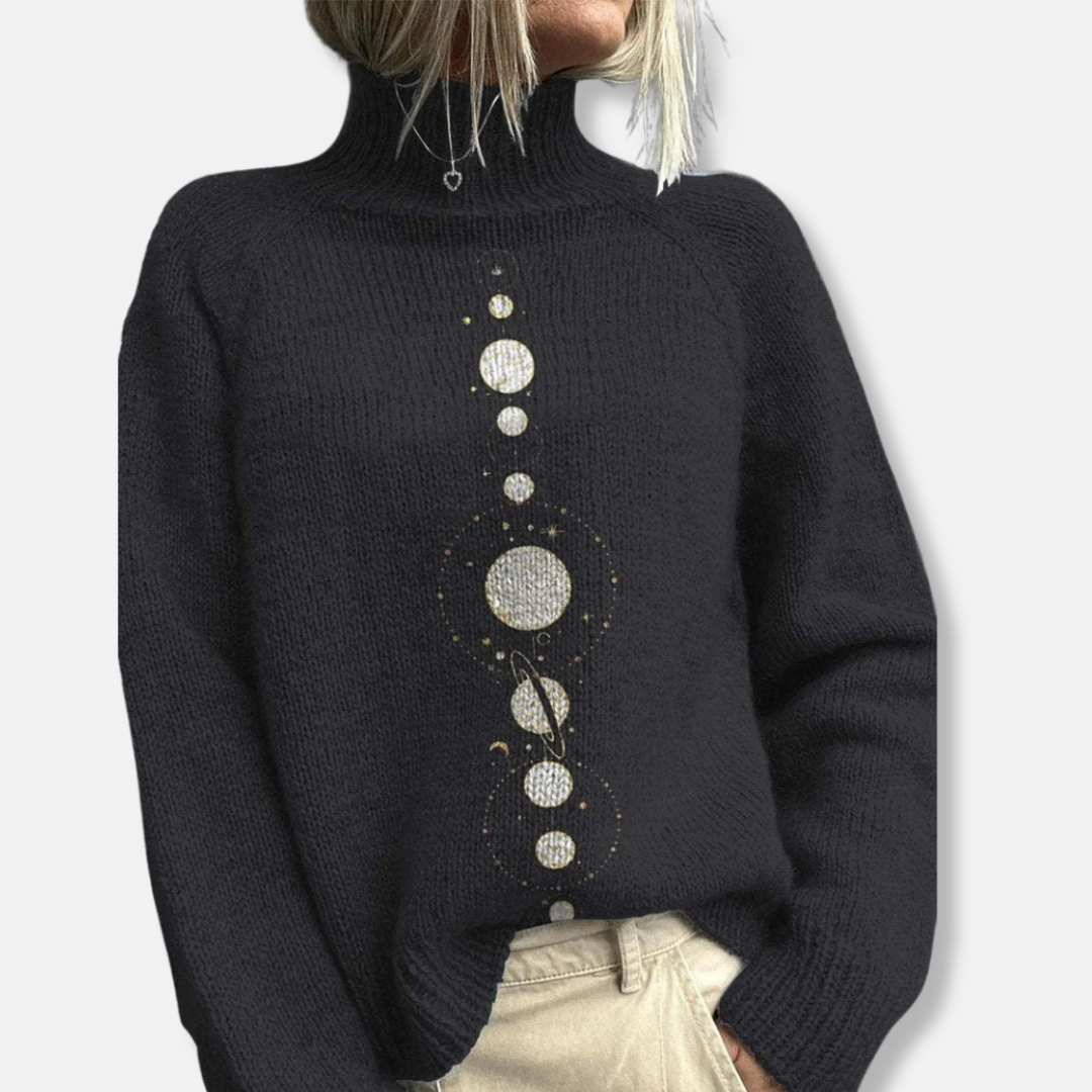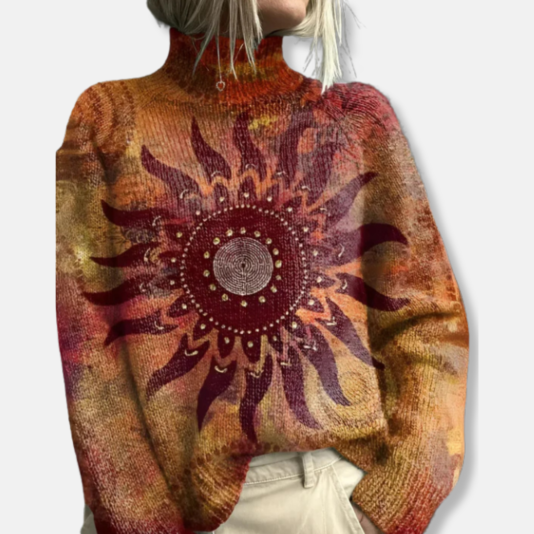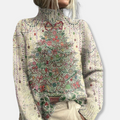 Deze dames pullover is vervaardigd uit zachte tricot en heeft een relaxed fit. Het ontwerp kenmerkt zich door een hoge col en een versierd abstract motief, aangevuld met een multi-tonaal breisel en kraalversieringen.